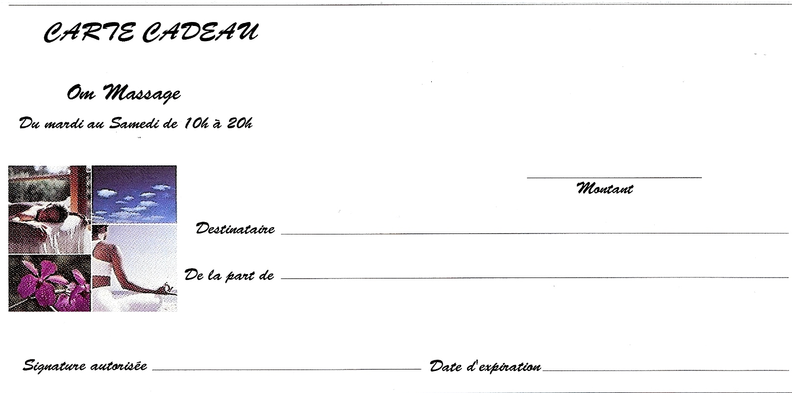 Om massage, vous propose des bons cadeaux personnalisés pour faire plaisir à votre entourage. Pour chaque soin offert, une carte cadeau sera remise à la personne de votre choix.
